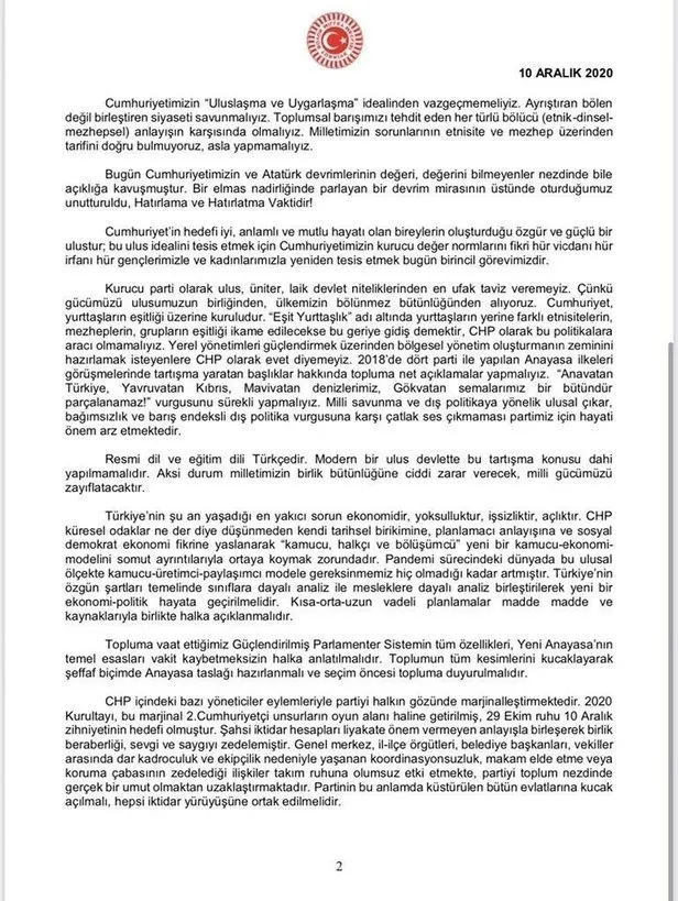 “CHP yönetimine yazdığımız 10 Aralık 2020 tarihli, iktidar için politik hat ve eksik parti içi demokrasi uygulamalarına dair mektubumuza 1 aydan fazla süre geçmesine rağmen resmî (yazılı-sözlü) cevap gelmemiş, hiçbir adım atılmamıştır. Görüşlerimizi kamuoyunun takdirine sunuyoruz.”
