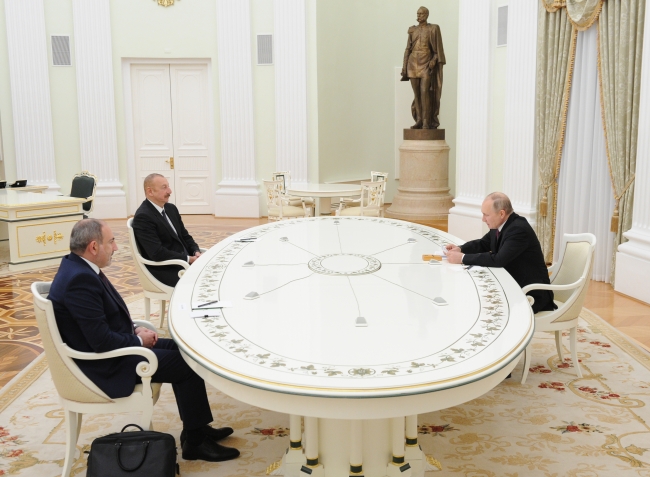 [Rusya Devlet Başkanı Vladimir Putin, Azerbaycan Cumhurbaşkanı İlham Aliyev ve Ermenistan Başbakanı Nikol Paşinyan, Dağlık Karabağ’ın geleceği için ortak bildiriyi Rusya’nın başkenti Moskova’da imzaladı. Fotoğraf: Getty]