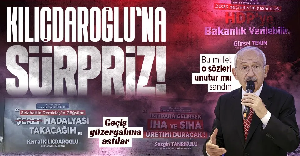 Ziyaret öncesi kent merkezine asılan bilbordda Kılıçdaroğlu’na kendisinin ve bazı CHP’lilerin kullandığı, ‘İHA ve SİHA üretimi duracak’,’HDP’ye bakanlık verilebilir’, ‘Türkiye maalesef Azerbaycan’a yardım ediyor’, ‘Selahattin Demirtaş’ın göğsüne şeref madalyası takacağım’ şeklinde ifadeler hatırlatıldı.