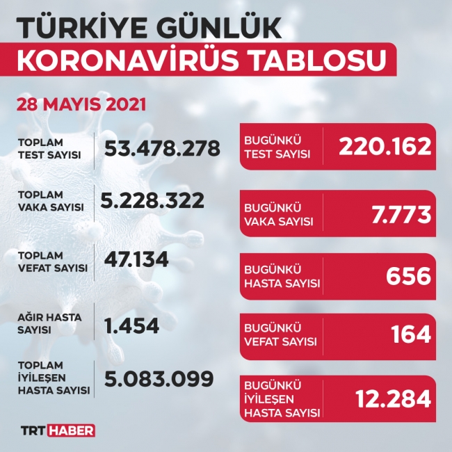 TÜHA HABER / Son 24 saatte 7 bin 773 yeni vaka, 656 yeni hasta tespit edildi. 164 kişi koronavirüs sebebiyle hayatını kaybetti.